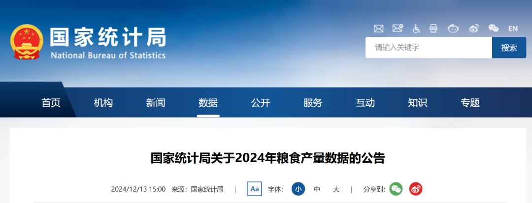 中国国家统计局13日公布,2024年中国粮食总产量14130亿斤,比上年增加221.8亿斤,增长1.6%,在连续9年稳定在1.3万亿斤以上的基础上,首次迈上1.4万亿斤新台阶。